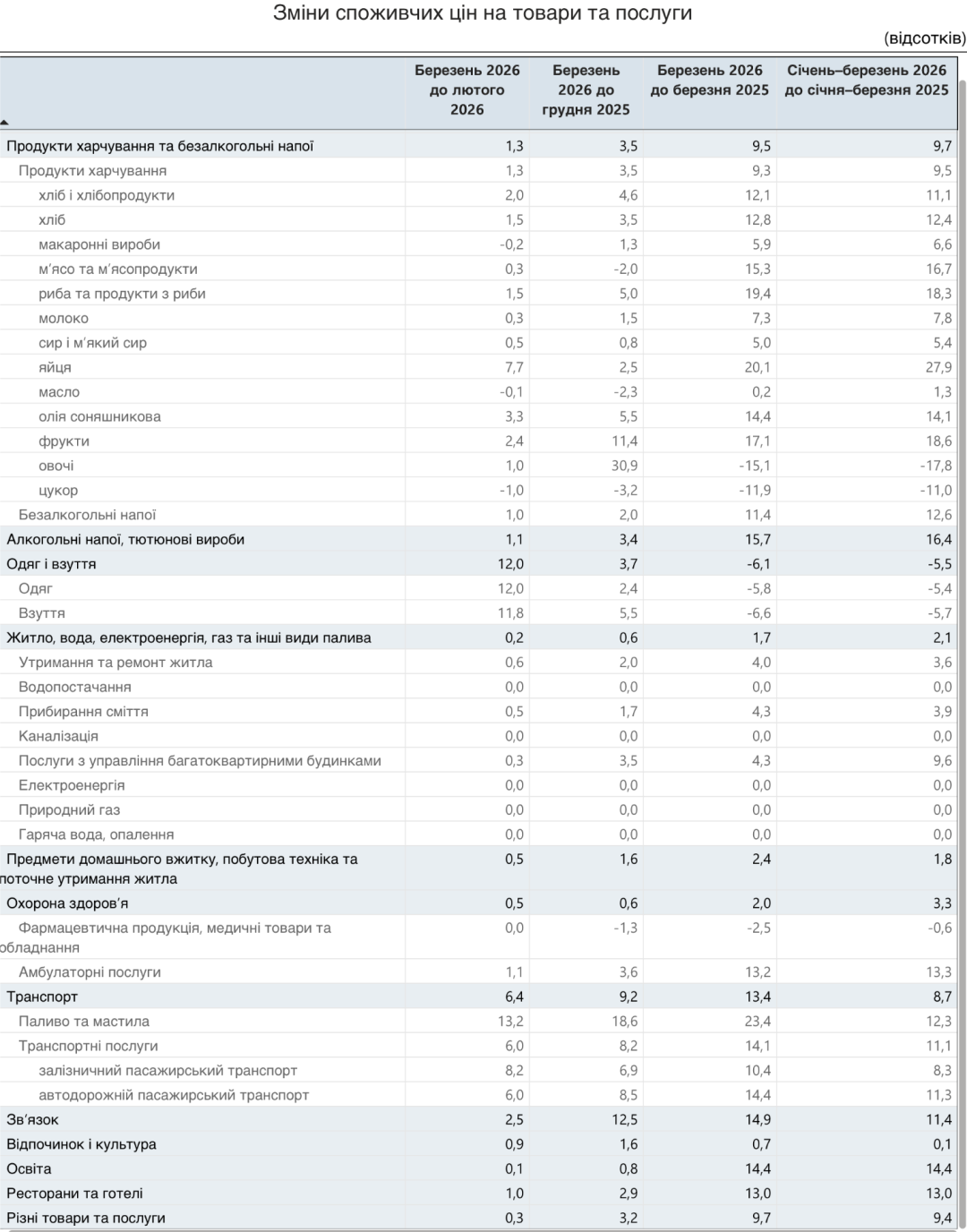 За даними Держстату, на споживчому ринку в березні ціни на продукти харчування та безалкогольні напої зросли на 1,3%. Найбільше (на 7,7%) подорожчали яйця (у річному вимірі – на 20,1%). На 4,8–0,8% зросли ціни на продукти переробки зернових, соняшникову олію, фрукти, хліб, рибу та продукти з риби, яловичину, овочі, безалкогольні напої, сало. Водночас на 1,0–0,1% знизилися ціни на цукор, макаронні вироби, рис, свинину, м’ясо птиці, масло.