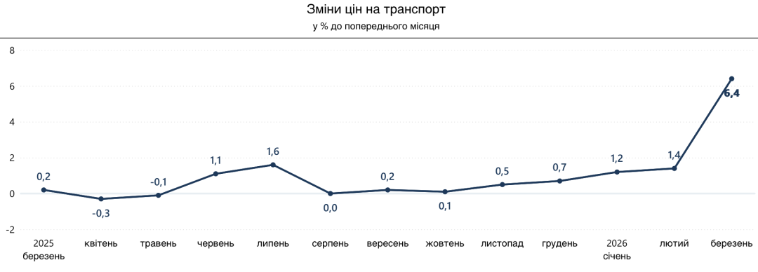 Ціни на транспорт зросли на 6,4% головним чином через подорожчання палива та мастил на 13,2% (річний показник – 23,4%) і проїзду в залізничному й автодорожньому пасажирському транспорті на 8,2% і 6,0% відповідно.