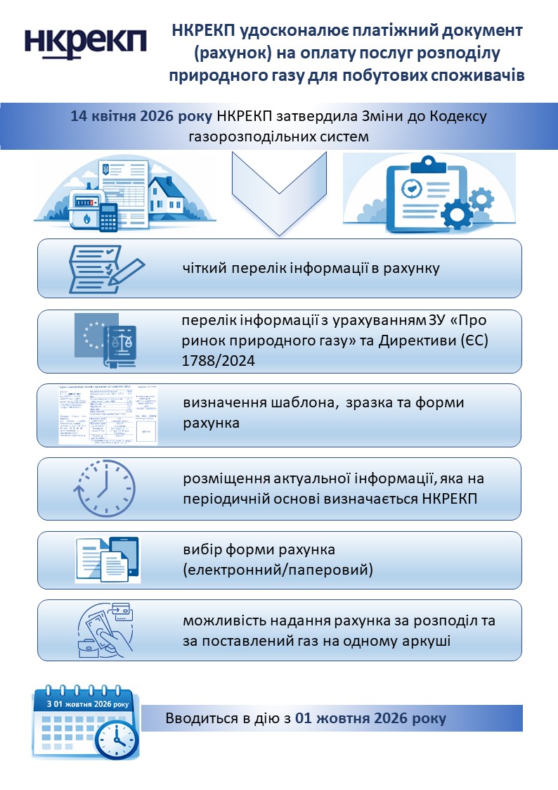 Регулятор, зокрема, визначив чіткий перелік інформації, яка має міститися в платіжних документах для побутових споживачів відповідно до Директиви (ЄС) 1788/202, а також шаблон, зразки та форми рахунка.