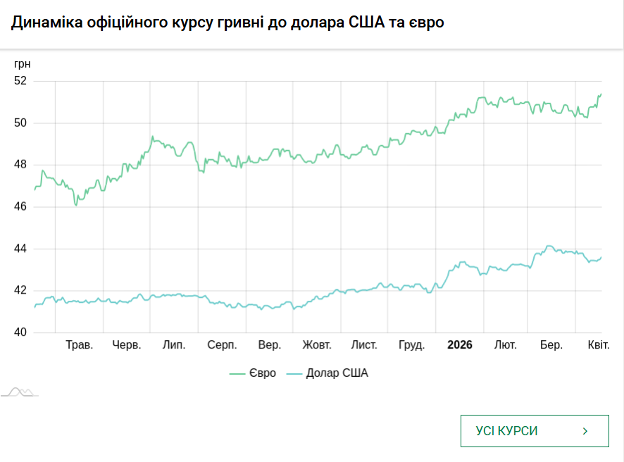 - 1 євро – 51,76 грн (51,42 грн станом на 17 квітня).