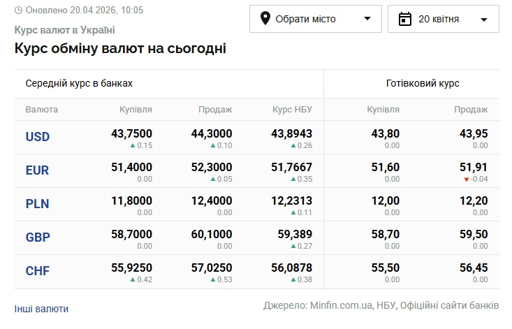 - 1 долар США – 43,89 грн (43,63 грн станом на 17 квітня)