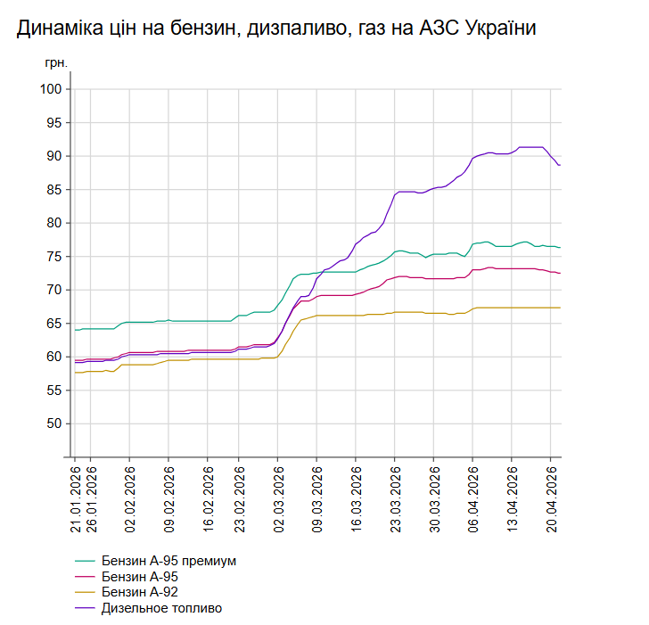Як повідомлялось, у понеділок, 20 квітня, середня ціна на бензин марки А-95 знизилася на 30 коп. до 72,71 грн/л, на дизельне пальне - на 1 грн 33 коп. до 89,92 грн/л.