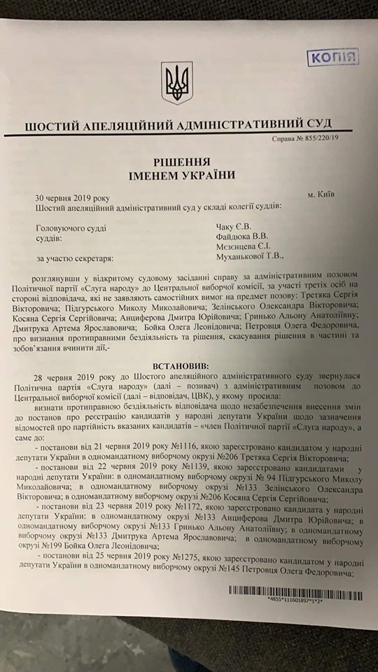 Рішення суду від 30 червня оприлюднено на сторінці "Слуги народу" у Facebook.