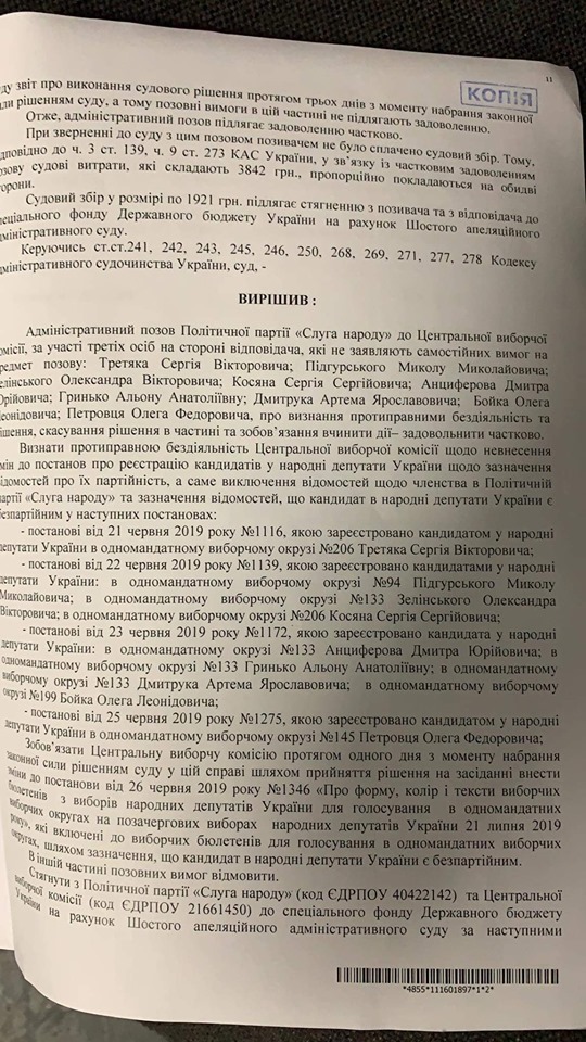 Як повідомлялося раніше, партія "Слуга народу" подала позов до суду зобов’язати ЦВК вказати у бюлетенях як безпартійних 9 кандидатів у народні депутати, які раніше надали неправдиву інформацію про свою належність до цієї політсили.