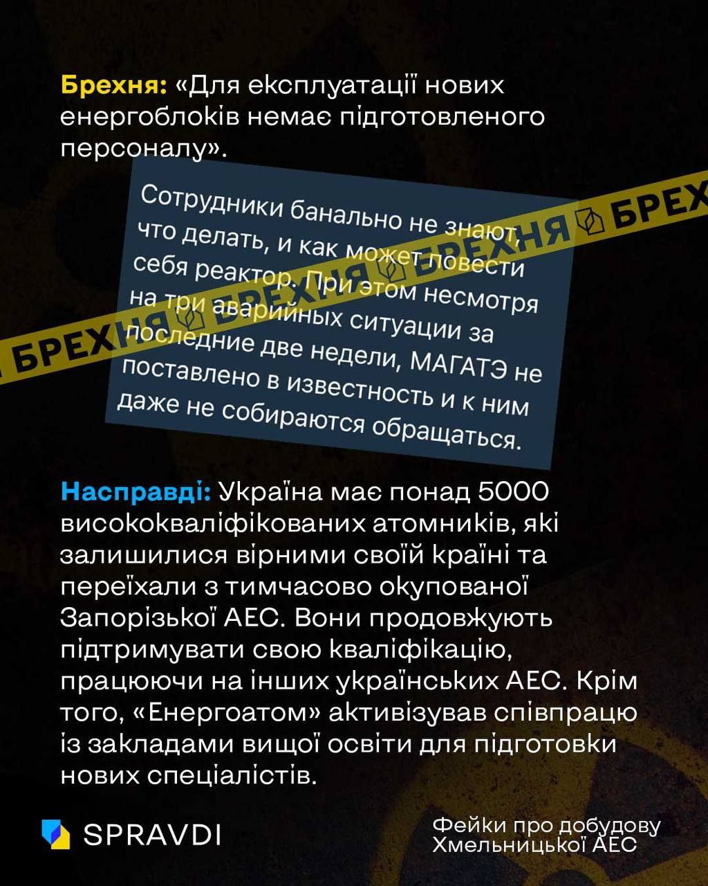 Насправді: Україна має понад 5000 висококваліфікованих атомників, які залишилися вірними своїй країні та переїхали з тимчасово окупованої Запорізької АЕС. Вони продовжують підтримувати свою кваліфікацію, працюючи на інших українських АЕС. Крім того, "Енергоатом" активізував співпрацю із закладами вищої освіти для підготовки нових спеціалістів.