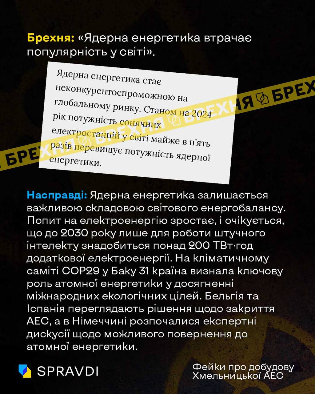 Насправді: Ядерна енергетика залишається важливою складовою світового енергобалансу. Попит на електроенергію зростає, і очікується, що до 2030 року лише для роботи штучного інтелекту знадобиться понад 200 ТВт·год додаткової електроенергії. На кліматичному саміті СОР29 у Баку 31 країна визнала ключову роль атомної енергетики у досягненні міжнародних екологічних цілей. Бельгія та Іспанія переглядають рішення щодо закриття АЕС, а в Німеччині розпочалися експертні дискусії щодо можливого повернення до атомної енергетики.