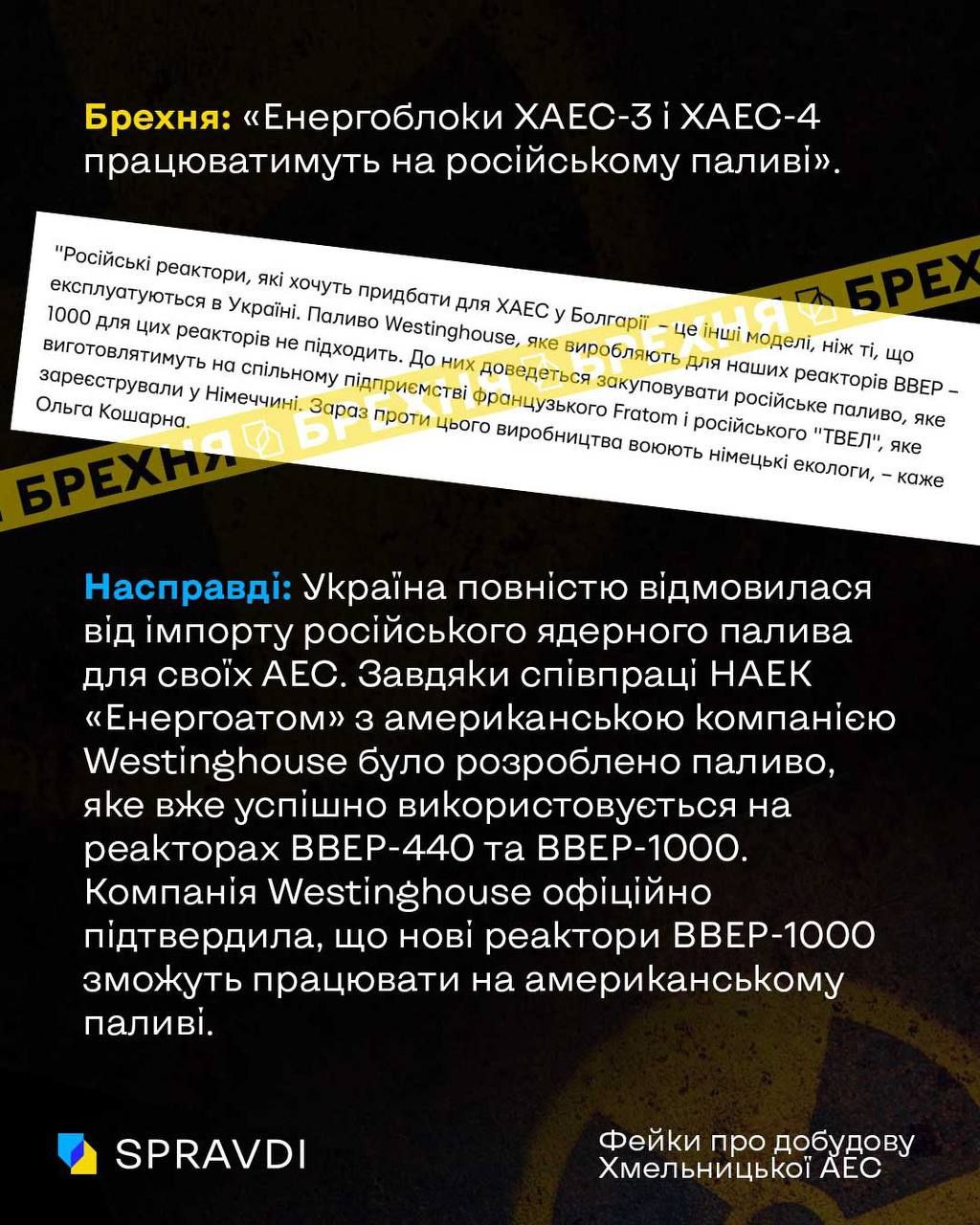 Брехня: «Енергоблоки ХАЕС-3 і ХАЕС-4 працюватимуть на російському паливі».