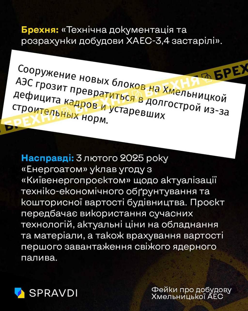 Насправді: 3 лютого 2025 року «Енергоатом» уклав угоду з «Київенергопроєктом» щодо актуалізації техніко-економічного обґрунтування та кошторисної вартості будівництва. Проєкт передбачає використання сучасних технологій, актуальні ціни на обладнання та матеріали, а також врахування вартості першого завантаження свіжого ядерного палива.