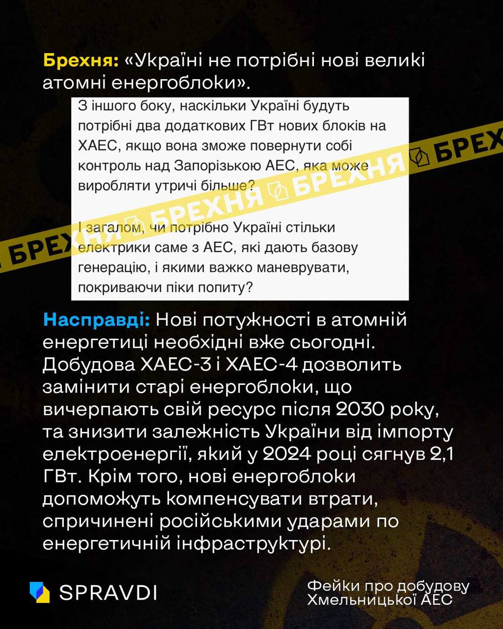 Насправді: Нові потужності в атомній енергетиці необхідні вже сьогодні. Добудова ХАЕС-3 і ХАЕС-4 дозволить замінити енергоблоки, що вичерпають свій ресурс після 2030 року, та знизити залежність України від імпорту електроенергії, який у 2024 році сягнув 2,1 ГВт. Крім того, нові енергоблоки допоможуть компенсувати втрати, спричинені російськими ударами по енергетичній інфраструктурі.