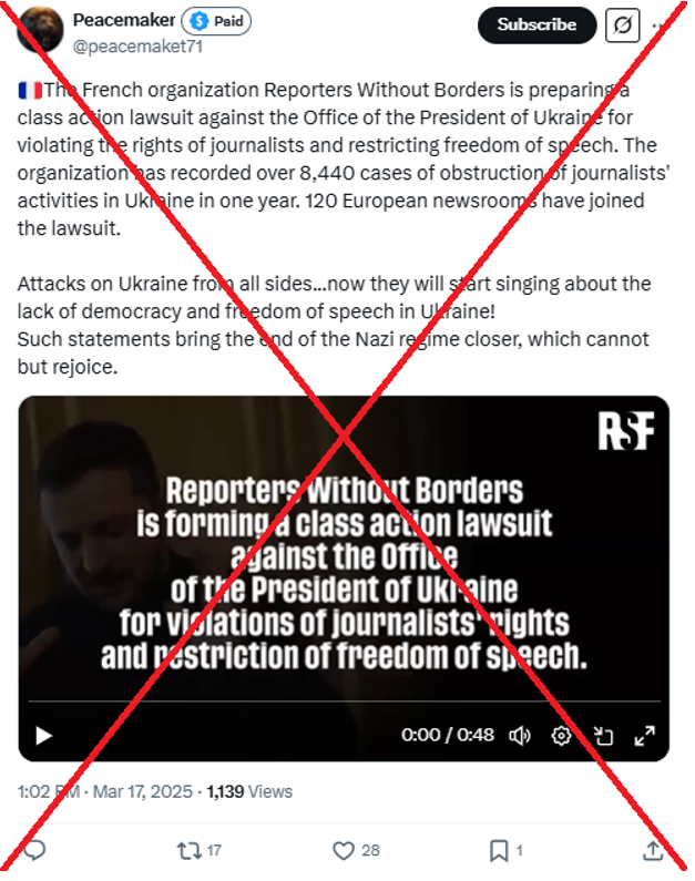 Російські телеграм-канали і боти у соцмережах Х та Інстаграмі поширюють відео від імені міжнародної некомерційної організації «Репортери без кордонів» (RSF). У ролику стверджується, що співробітники організації нібито зафіксували в Україні 8440 випадків порушення свободи слова та перешкоджань роботі журналістів за рік. Через це буцімто організація разом зі 120 європейськими медіа, серед яких BBC, Deutsche Welle, Euronews, France24 та ін., збирається подати до суду на Офіс Президента України.