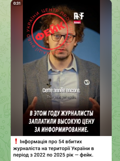 Раніше Центр протидії дезінформації спростував фейкове відео буцімто від імені «Репортерів без кордонів», яке поширювали ворожі телеграм-канали. У цьому ролику стверджувалося, що у період з 2022 по 2025 рік в Україні нібито вбили 54 журналістів. Ще 167 вважають зниклими безвісти.