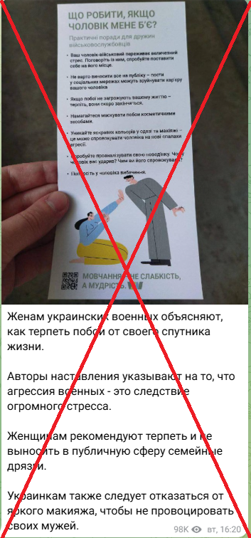 Російські ЗМІ, телеграм-канали та боти у соцмережі Х поширюють рекламний бюлетень, який начебто призначений для дружин українських військовослужбовців. У ньому наводяться правила, які закликають терпіти домашнє насильство зі сторони чоловіка.