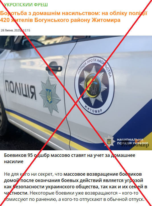 Також російські телеграм-канали поширюють скриншот українського медіа зі статтею про взяття поліцією на облік 420 жителів Богунського району Житомира. У дописі до фото зазначено, буцімто серед них є чимало військових 95-ї ОДШБр.