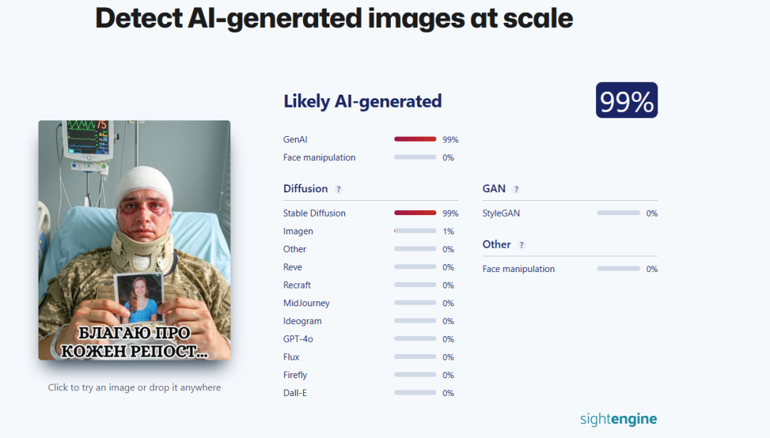 Крім того, російські медіа поширюють фото буцімто пораненого солдата ЗСУ, який начебто лежить у шпиталі та тримає в руках фото своєї дружини. У дописі до картинки стверджується, що він хоче її повернути, але вона пішла через домашнє насильство зі сторони військового.