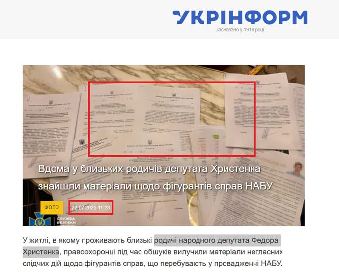 Окрім цього, для створення фейкового відео пропагандисти використали кадри матеріалів з іншої справи, викладених раніше в Інтернеті. Оригінальні фото були зроблені під час обшуків слідчих СБУ у родичів народного депутата Федора Христенка у справі щодо витоків конфіденційних даних з НАБУ.