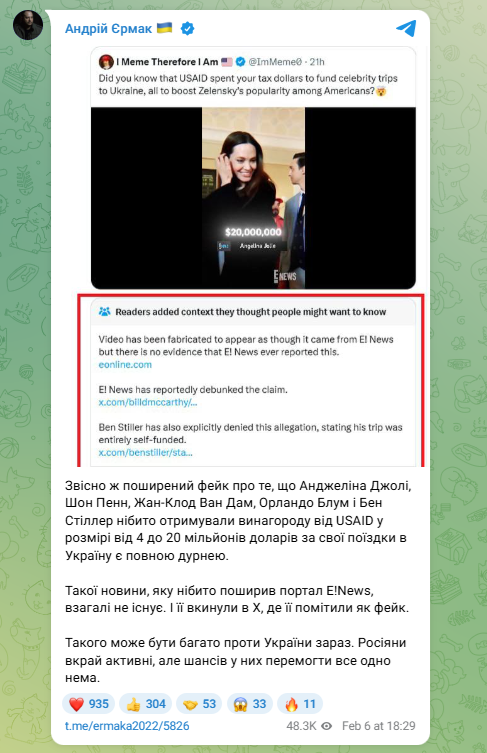 Зазначимо, що росіяни не вперше поширюють подібні фейки. Раніше голова Офісу Президента Андрій Єрмак особисто спростував інформацію про те, що актори Анджеліна Джолі, Шон Пенн, Жан-Клод Ван Дам, Орландо Блум і Бен Стіллер нібито отримували винагороду від USAID у розмірі від 4 до 20 мільйонів доларів за свої поїздки до України.