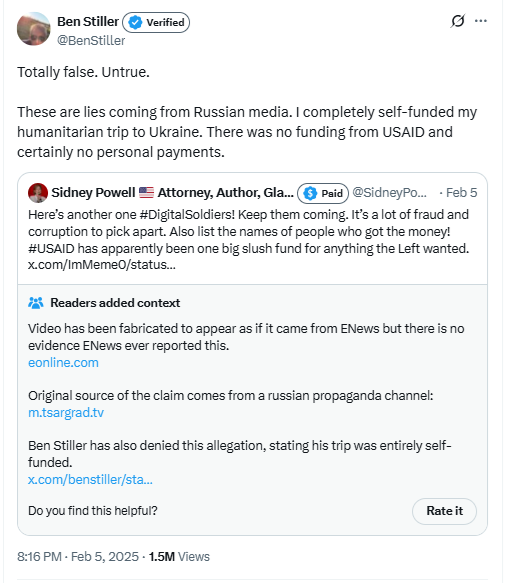 Крім того, інформацію про «фінансовий стимул» приїзду голлівудських зірок в Україну публічно спростували самі актори. Зокрема Бен Стіллер у соцмережі X написав, що ця новина — брехня, яка походить від російських ЗМІ.