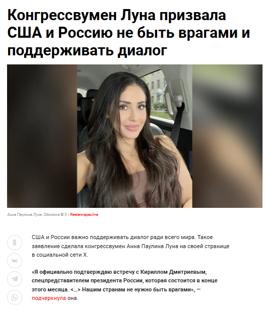 По-третє, сама конгресвумен відкрито симпатизує Росії та виступає за відновлення дружніх відносин США з країною-агресором. Наприклад, у жовтні Луна цитувала помічника Путіна Кирила Дмітрієва у своєму акаунті в соцмережі Х.