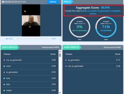 Це фейк. Відео повністю згенероване штучним інтелектом, зокрема використана технологія діпфейку. За даними сервісу для виявлення контенту, створеного ШІ, Hive Moderation, дане відео має штучне походження з вірогідністю у 98,6%.