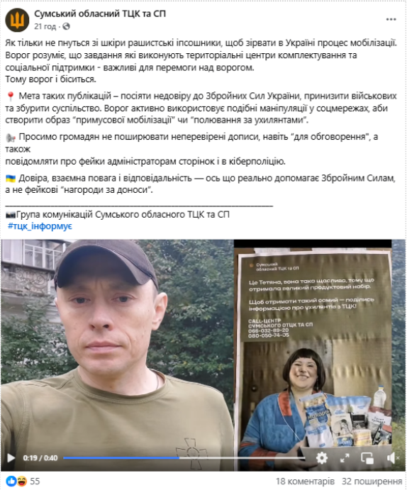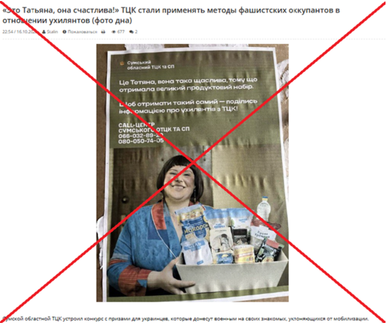 Крім того, російські ЗМІ та телеграм-канали поширюють фото, начебто зроблене у місті Суми. На ньому – оголошення від місцевого ТЦК та СП про видачу продуктових наборів жінкам за видавання осіб, які ухиляються від військового призову.