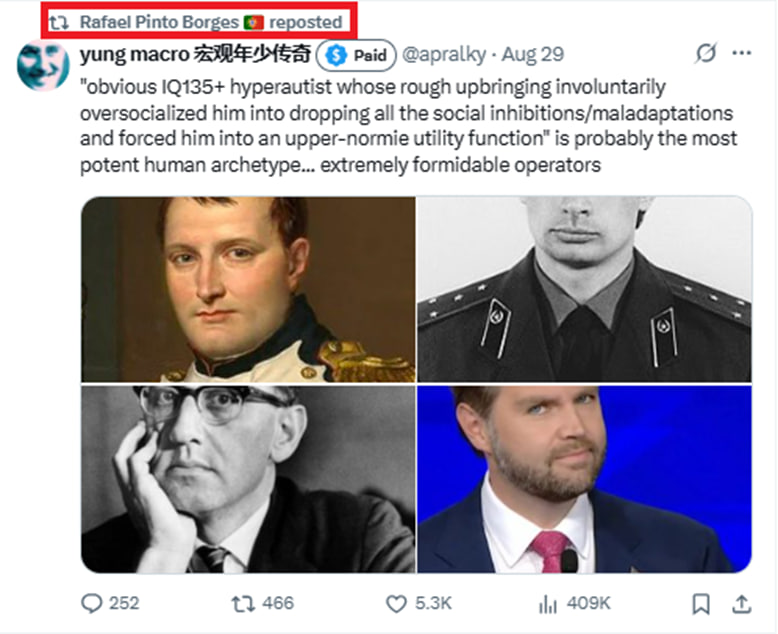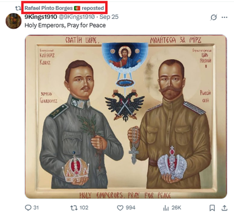 Він є правим португальським націоналістом, захоплюється російським диктатором Володимиром Путіним та останнім імператором російської імперії Миколою ІІ. На сторінці Борхеса у соцмережі Х є репости з портретами та іконами російського царя та компліментарні меми про Путіна.