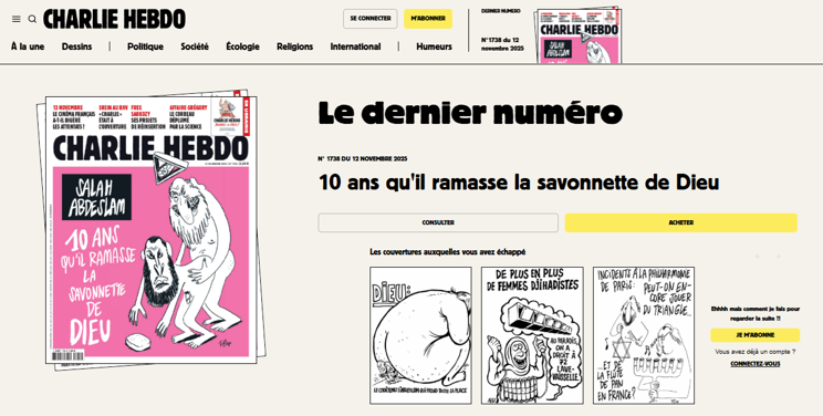 Це фейк. Такої обкладинки немає ані на офіційному сайті Charlie Hebdo, ані у соцмережах видання, де зазвичай публікуються перші сторінки нових випусків.