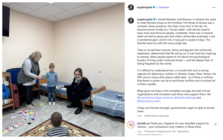 «…я відвідала Миколаїв і Херсон в Україні, щоб зустрітися з сім'ями, які живуть на лінії фронту. Загроза безпілотників була постійною і відчутною - у небі чути тихе гудіння. Місцеві жителі називають це «сафарі на людей», адже дрони використовуються для стеження, полювання і терору. Був момент, коли нам довелося зупинитися і перечекати, поки безпілотник пролетить над нами. Я була у захисному спорядженні, і для мене це тривало лише кілька днів, а ці родини так живуть щодня», - зазначила акторка та амбасадорка доброї волі ЮНІСЕФ.