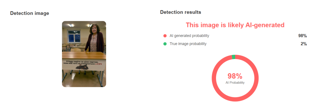 Це фейк. Дане зображення згенероване штучним інтелектом. Це підтверджують сервіси для розпізнавання ШІ-підробок WasitAI, Reversely та DecopyAI.