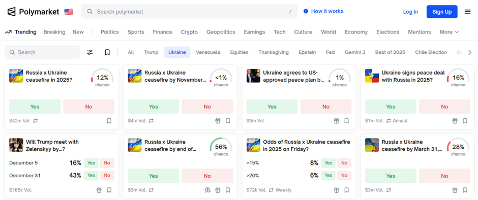 Це фейк. По-перше, на офіційному сайті Polymarket немає ставки, про яку пишуть пропагандисти РФ. Платформа зокрема приймає парі щодо того, чи підпише Україна «мирну угоду» США щодо можливого завершення війни чи коли може відбутися «припинення вогню».