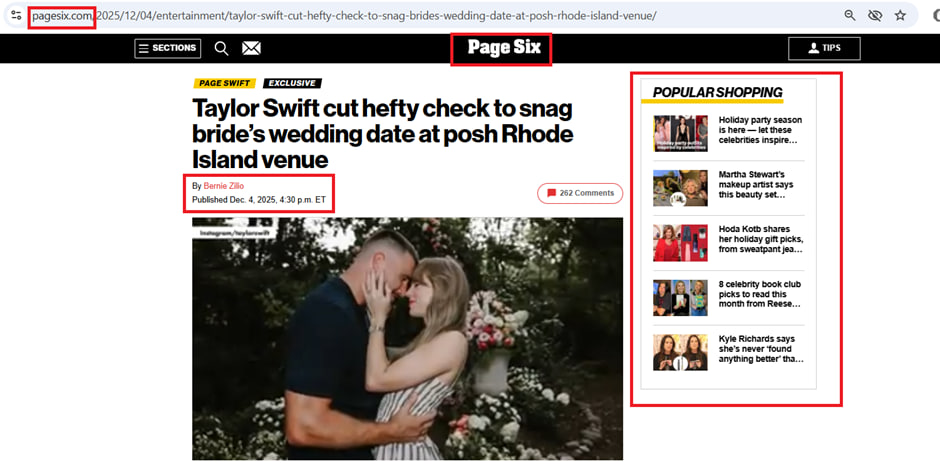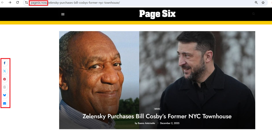 У фейкового сайту назва домену - pagesix.now, замість pagesix.com. Також сайт-клон не містить посилань на соцмережі та має іншу структуру.