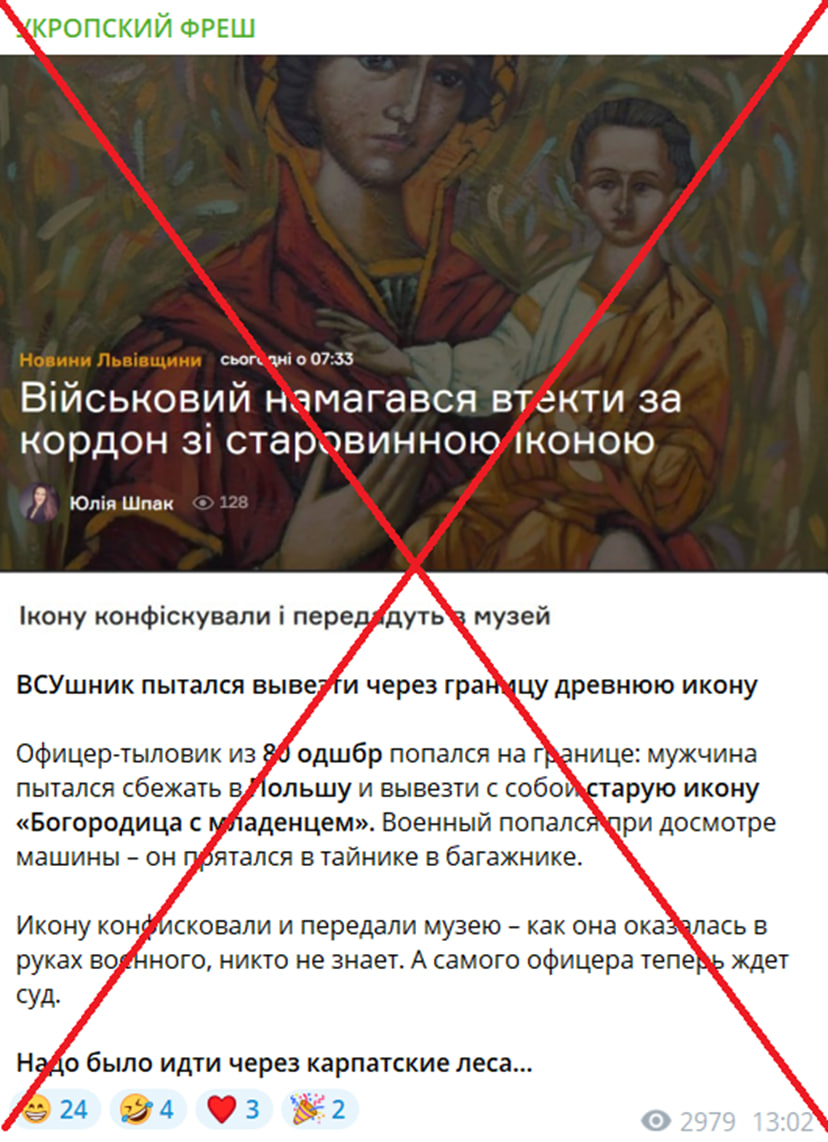 Російські телеграм-канали поширюють скріншот публікації одного з регіональних медіа на Львівщині. У ньому стверджується, що буцімто військовослужбовець намагався втекти за кордон зі старовинною іконою. У підписі до картинки зазначається, що нібито йдеться про військового із 80-ї ОДШБр.
