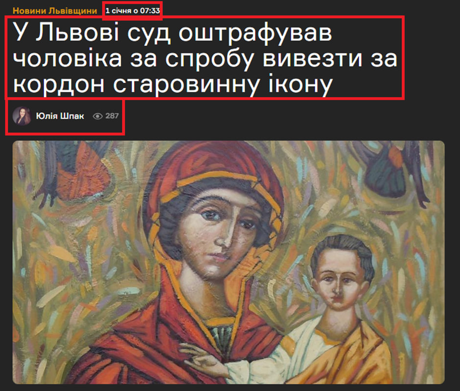 Це фейк. Заголовок публікації був змінений за допомогою графічного редактора. В оригінальному матеріалі, опублікованому у виданні Lviv.Media, був такий заголовок “У Львові суд оштрафував чоловіка за спробу вивезти за кордон старовинну ікону”.