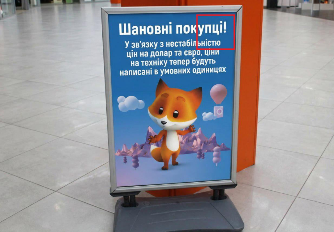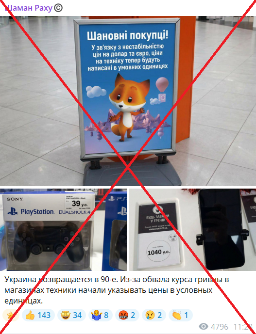 Російські телеграм-канали поширюють фото оголошення нібито однієї з українських мереж магазинів побутової техніки. Стверджується, що буцімто через нестабільність цін на долар та євро в Україні, цінники на товари компанії будуть вказуватися в «умовних одиницях». Також у дописах пропагандистів містяться зображення «оновлених» ярликів цін.