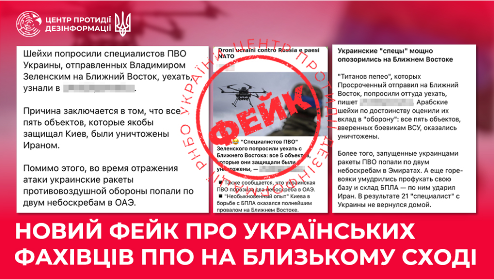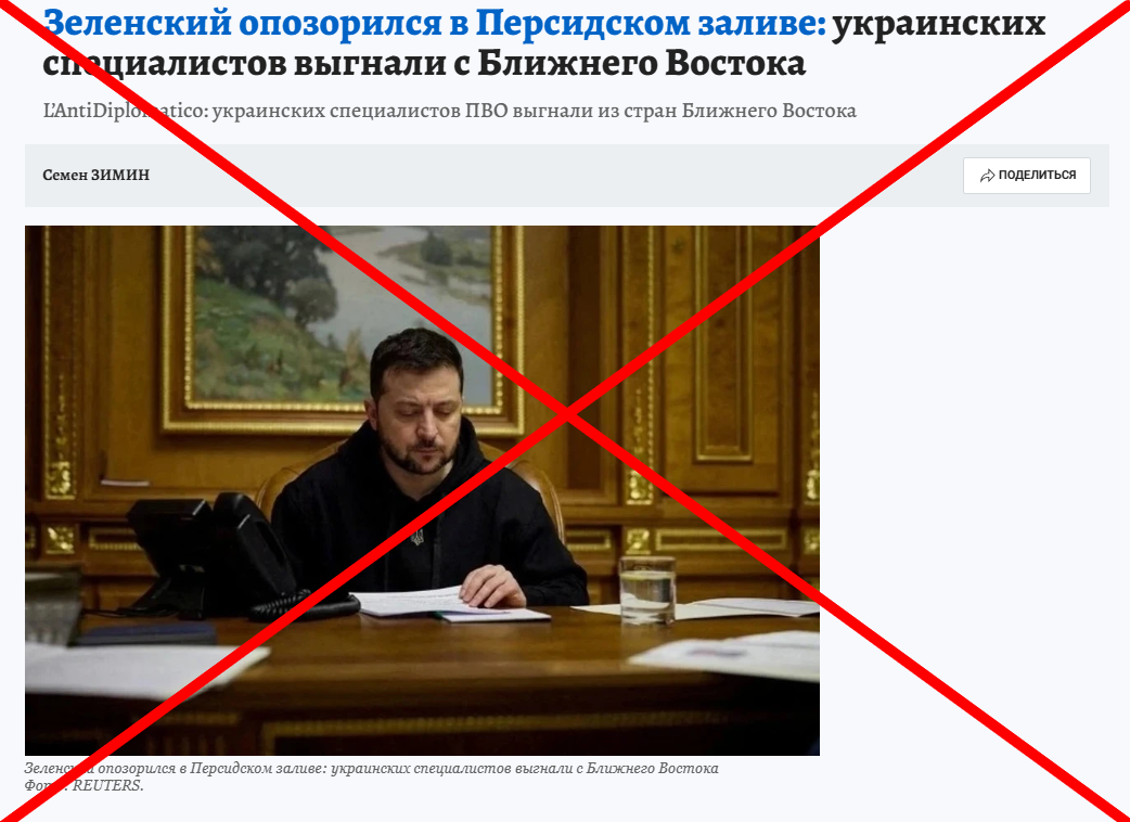 Російські медіа, пропагандистські телеграм-канали та акаунти у Фейсбуці, Інстаграмі та мережі Х поширюють інформацію про нібито відкликання українських фахівців ППО (операторів дронів-перехоплювачів) з Близького Сходу. У цих повідомленнях стверджується, що керівництво ОАЕ та Саудівської Аравії буцімто залишилося незадоволеним результатами їхньої роботи через удари Ірану по хмарочосах і нездатність захистити п’ять об’єктів інфраструктури, які їм було «доручено» охороняти. Як джерело інформації використовується матеріал італійського видання L’AntiDiplomatico.