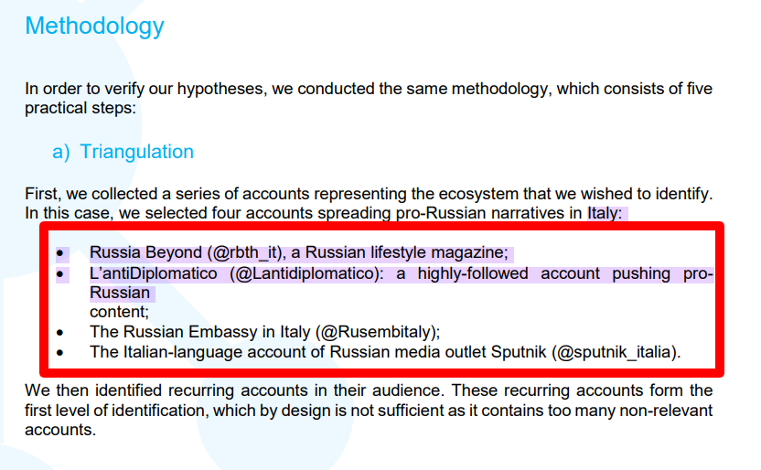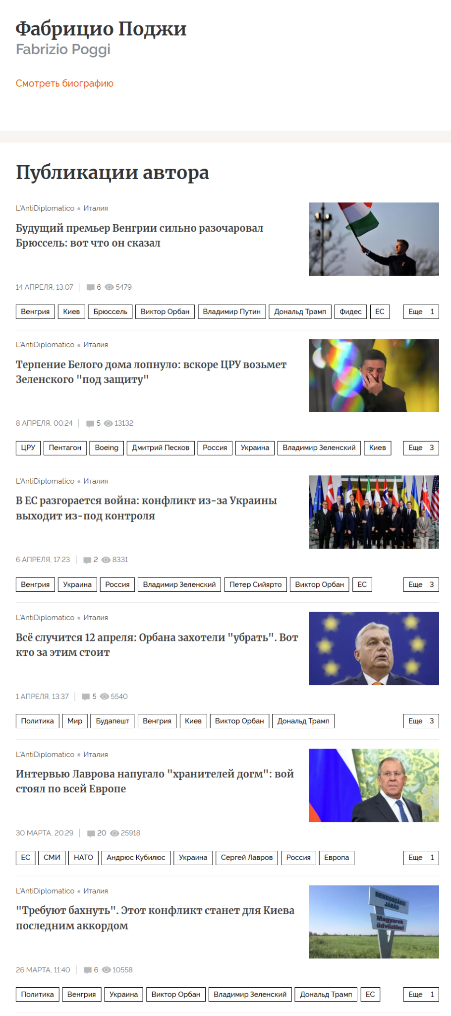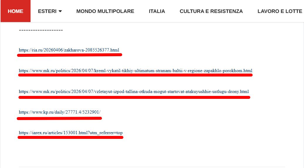 Окрім цього, L’AntiDiplomatico вже багато років поширює матеріали, що збігаються з російськими пропагандистськими наративами. Як повідомляла щоденна газета La Stampa у 2016 році, цей вебсайт був створений особами, пов’язаними з «Рухом п’яти зірок» - італійською партією, представники якої просували проросійські тези, зокрема називали Революцію гідності 2014 року «державними переворотом, профінансованим Європою та США». У 2018 році проєкт EUvsDisinfo у своєму дослідженні про італійські вибори визначив L’AntiDiplomatico як джерело проросійського контенту.