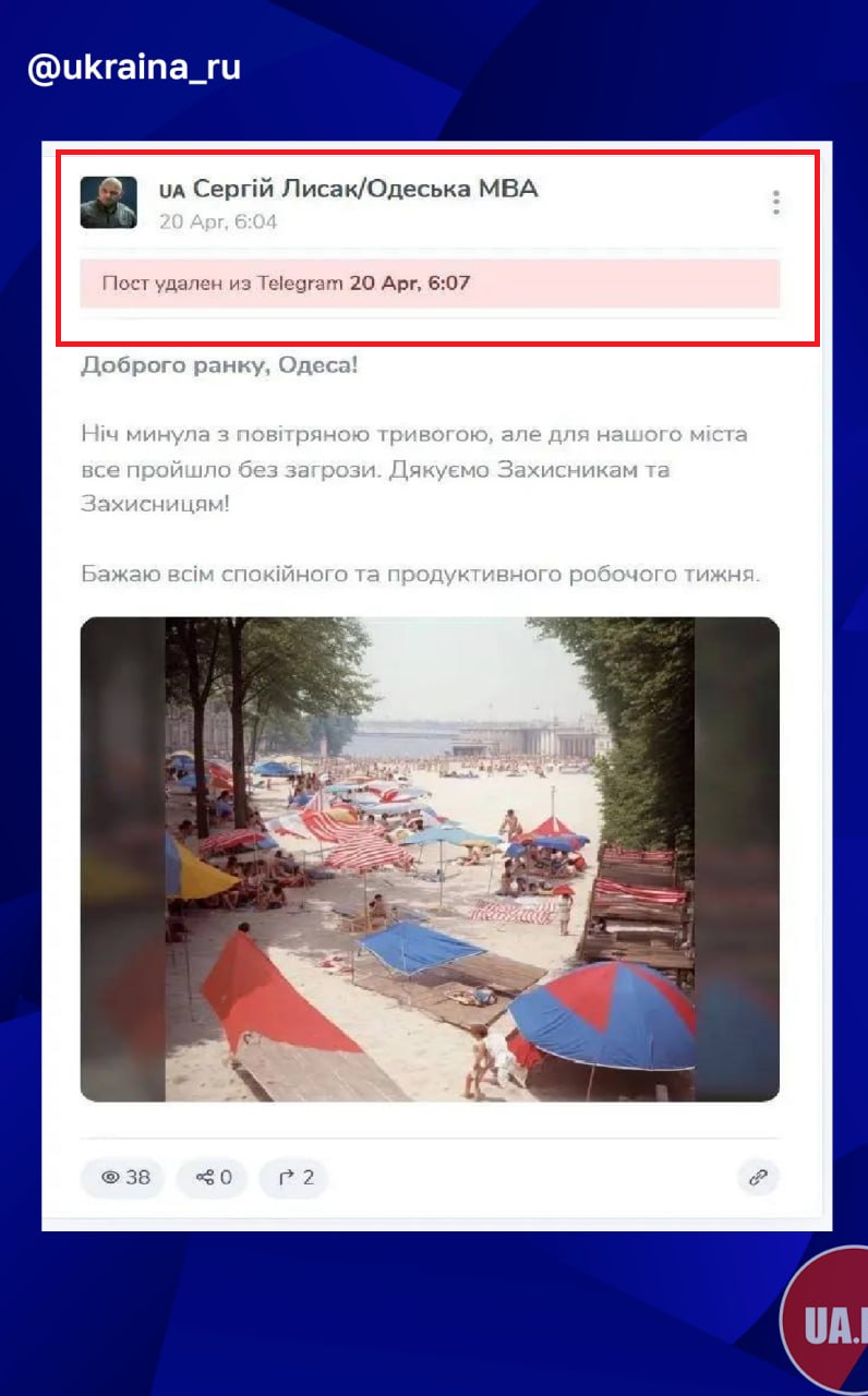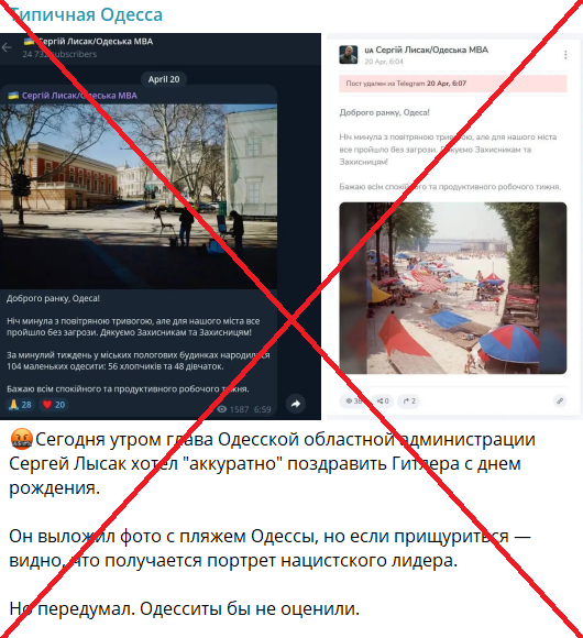 Російські медіа, телеграм-канали, а також боти у Facebook та X поширюють скриншот нібито видаленого допису в телеграм-каналі голови Одеської міської військової адміністрації Сергія Лисака. На зображенні – одеський пляж із силуетом Адольфа Гітлера. Стверджується, що очільник міста нібито хотів “привітати” мешканців із днем народження свого “кумира”, але згодом видалив допис і замінив його нейтральним ранковим привітанням.