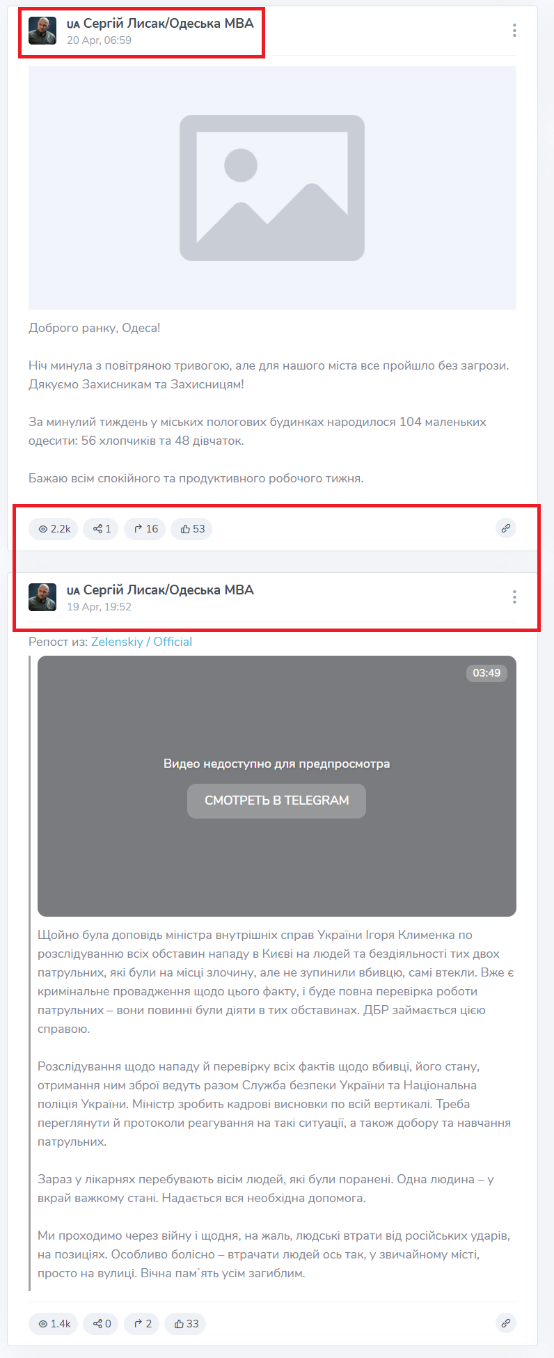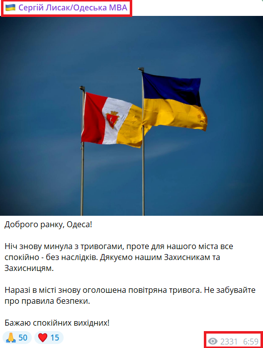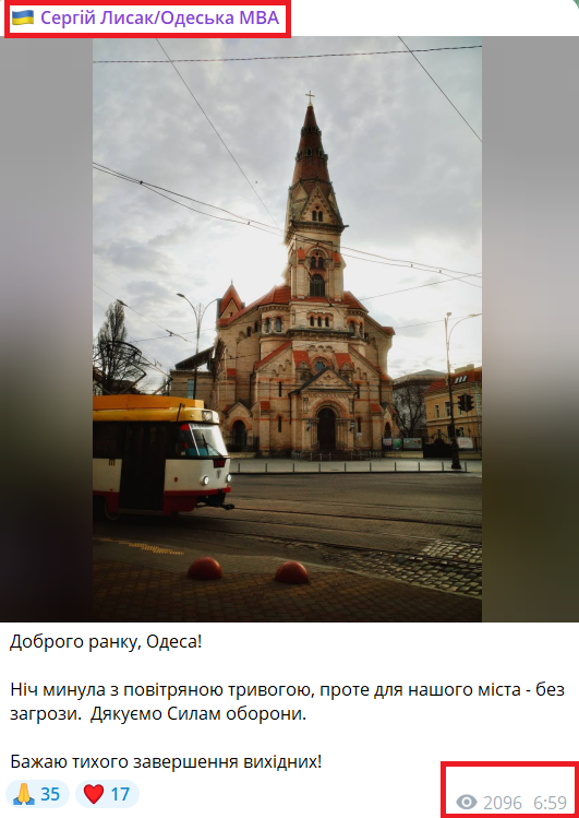 Не відповідає дійсності й російська теза про те, що замість “видаленої публікації” було розміщено інший, нейтральний допис. Привітання з добрим ранком було опубліковане о 06:59. Це типовий формат ранкових постів Сергія Лисака, й аналогічні публікації в той самий час можна побачити на його сторінці.