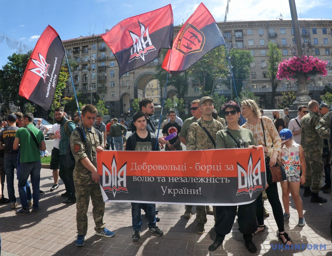 ВО "Свобода" проводить мітинг під стінами Київської міської державної адміністрації,  вимагаючи надання добровольцям, які воювали на Донбасі, усіх пільг, які передбачені для учасників бойових дій.