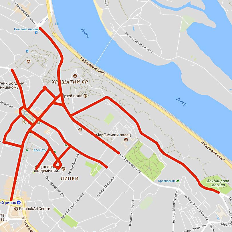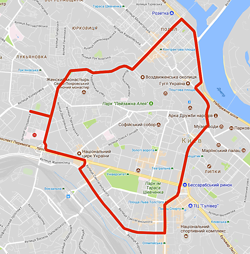 з 21:00 27 серпня до 02:00 28 серпня Європейська площа – Володимирський узвіз – вул. Петра Сагайдачного – вул. Андріївська – вул. Братська – вул. Іллінська – Контрактова площа – вул. Межигірська – вул. Спаська – вул. Набережно-Хрещатицька – вул. Нижній Вал – вул. Глибочицька – пров. Глибочицький – вул. В’ячеслава Чорновола – вул. Машала Рибалка – парк військової частини А0222;