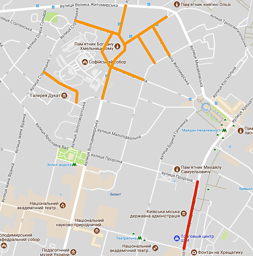 24 серпня з 06:00 і до завершення заходів буде закрито вул. Хрещатик; Європейська площа; Бессарабська площа; вул. Трьохсвятительська; вул. Костьольна; Майдан Незалежності; алея Героїв Небесної Сотні; вул. Інститутська від вул. Ольгинської до вул. Шовковичної; вул. Ольгинська; вул. Архітектора Городецького; площа І.Франка; вул. Заньковецької; вул. Банкова; вул. Лютеранська; вул. Круглоуніверситетська; бульвар Тараса Шевченко від вул. Леонтовича до Бессарабської площі; вул. Богдана Хмельницького від вул. Пушкінської до вул. Хрещатик; вул. Прорізна від вул. Пушкінської до вул. Хрещатик; вул. Бориса Грінченка від вул. Прорізної до Майдану Незалежності; Майдан Незалежності; вул. Алли Тарасової; Володимирський проїзд; вул. Володимирська від вул. Льва Толстого до вул. Богдана Хмельницького; вул. Льва Толстого від вул. Володимирської до вул. Терещенківської; вул. Володимирська від вул. Рейтарської до вул. Великої Житомирської; провулок Георгіївський; провулок Рильський; вул. Софіївська від Михайлівського провулку до вул. Володимирської; Софійська площа; Володимирський проїзд; вул. Мала Житомирська від Михайлівського провулку до Володимирського проїзду; вул. Терещенківська; вул. Рєпіна; вул. Михайлівська; вул. Велика Васильківська; площа Льва Толстого - на час проведення параду військ із проходженням у пішому порядку з нагоди відзначення 26-ї річниці Дня Незалежності України.