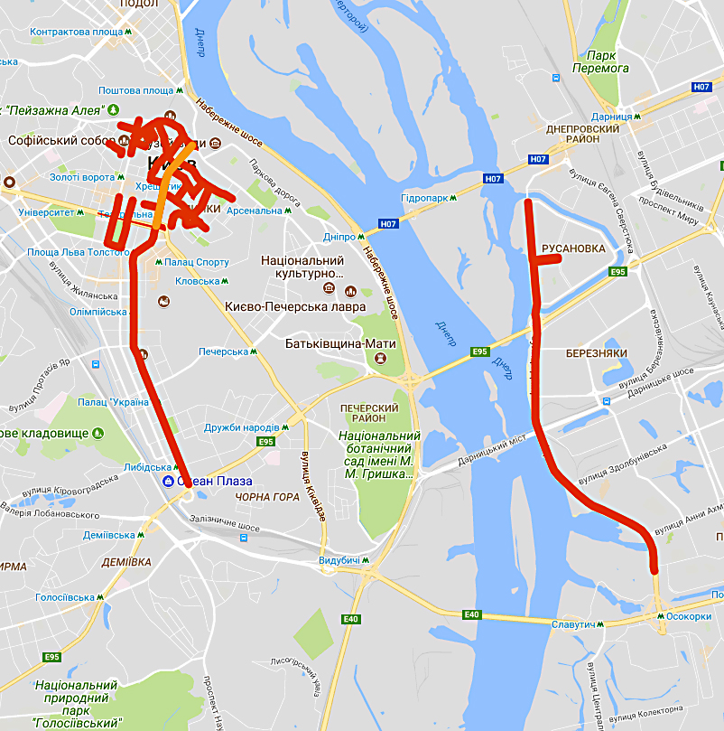 з 21:00 27 серпня до 06:00 28 серпня - Європейська площа – Петрівська алея – Паркова дорога – Дніпровський узвіз – Набережне шосе та далі: Південний міст – просп. Миколи Бажана – Харківська площа – Бориспільське шосе; Столичне шосе – вул. Академіка Заболотного – Одеська площа (М-03) – Кільцева дорога – проспект Перемоги (М-06).