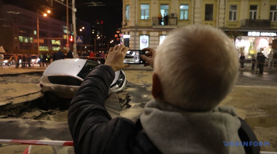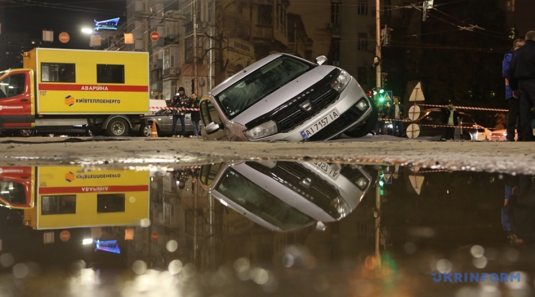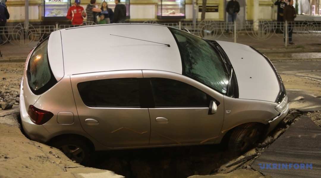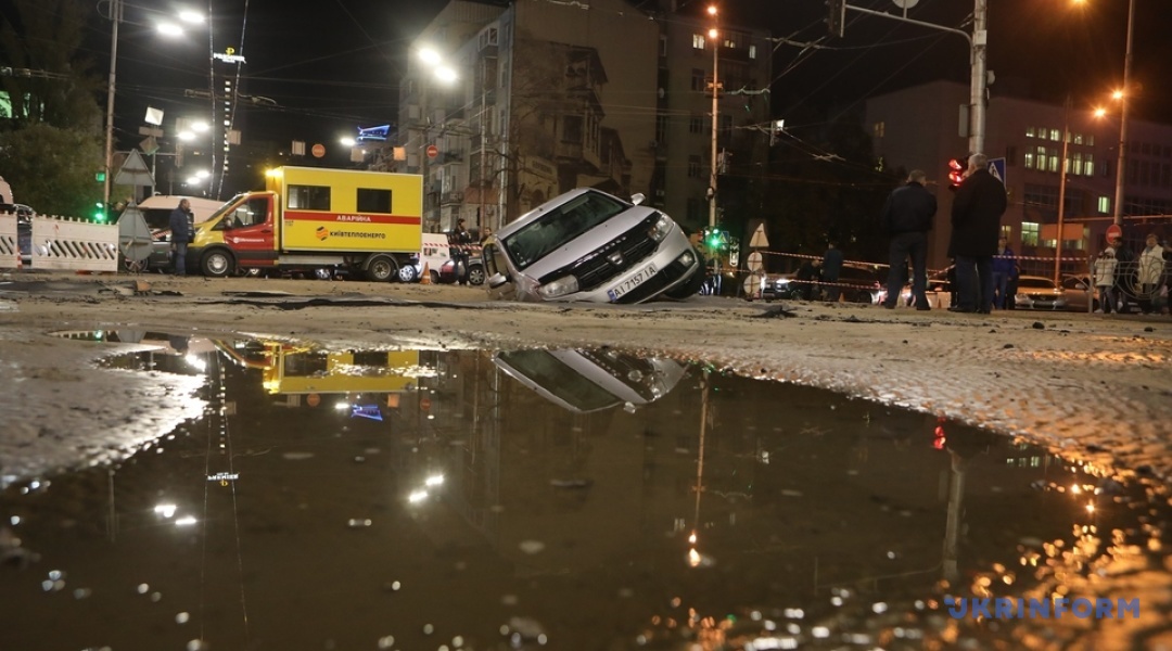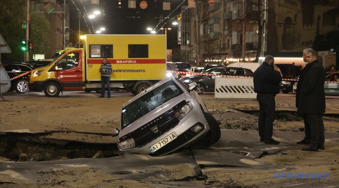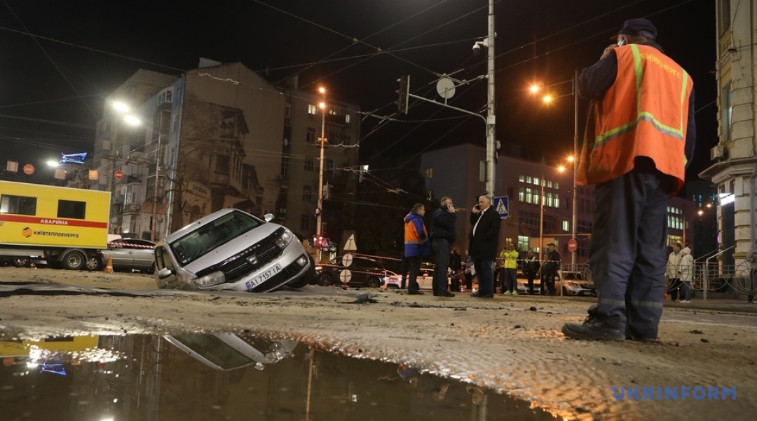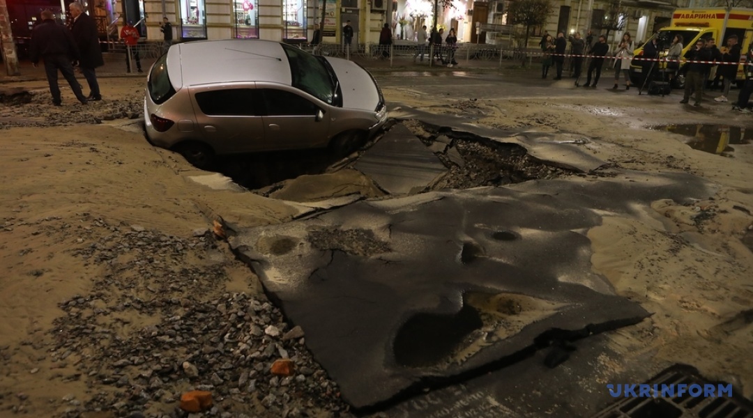Через тиск гарячої води там обвалився асфальт. Раніше повідомлялося, що в яму провалився один автомобіль.