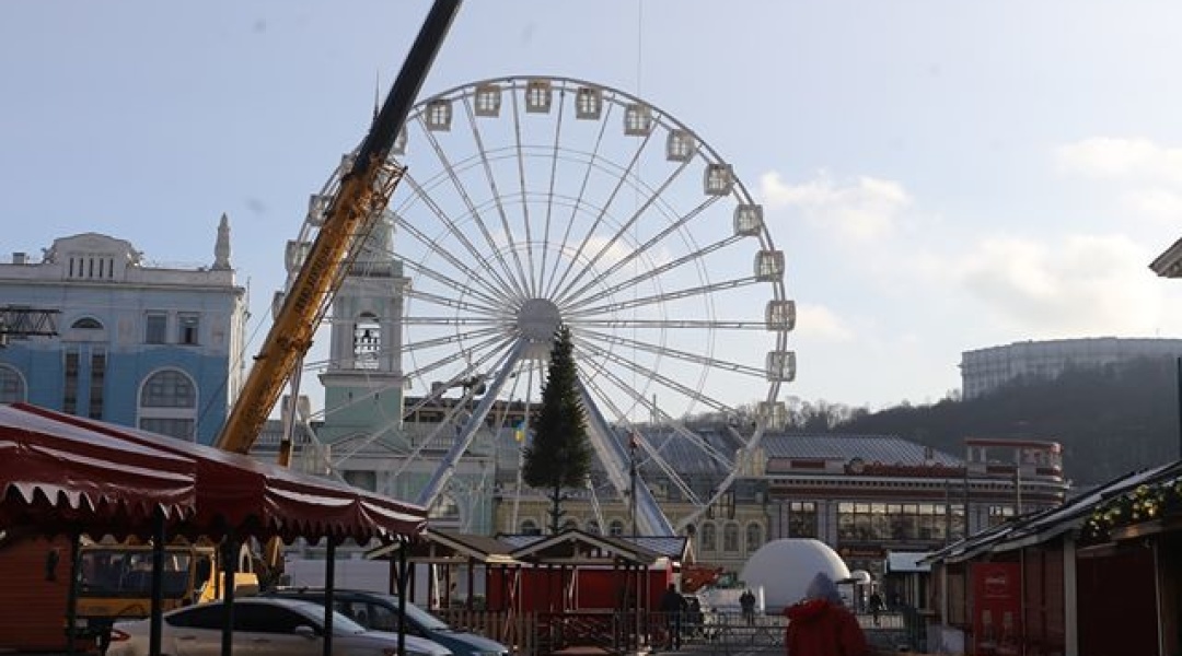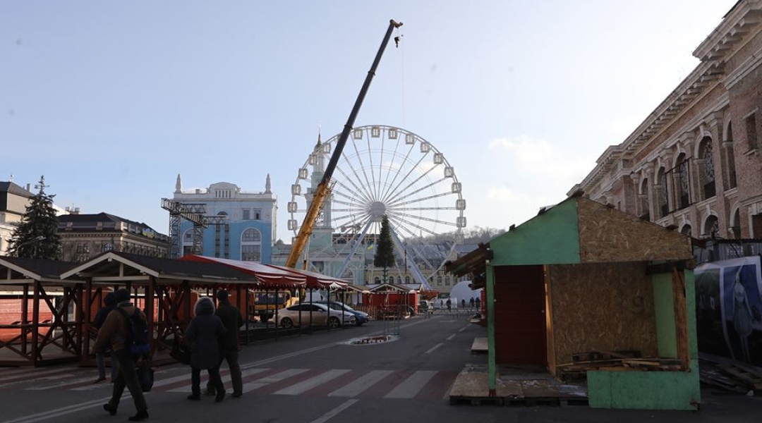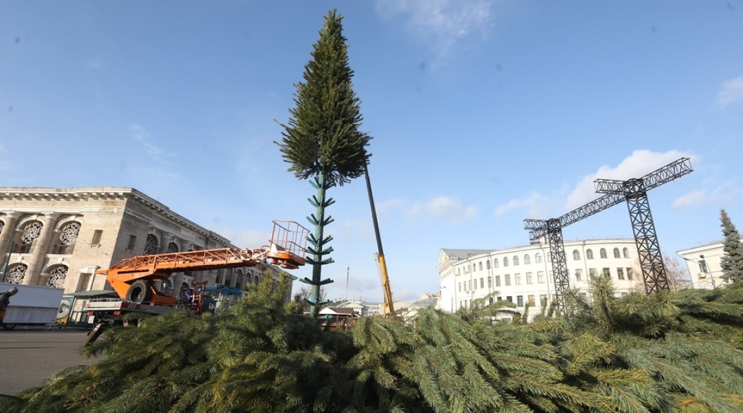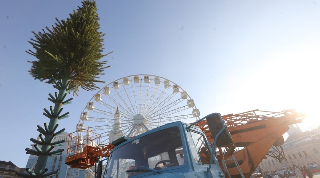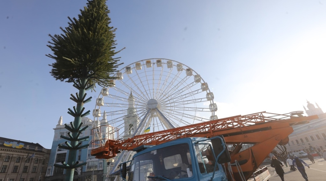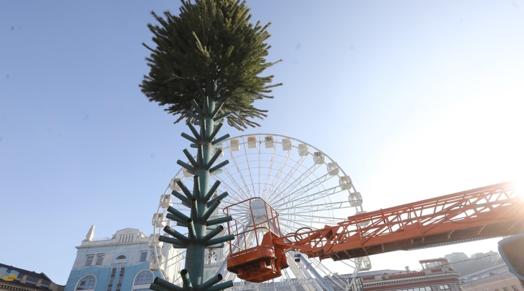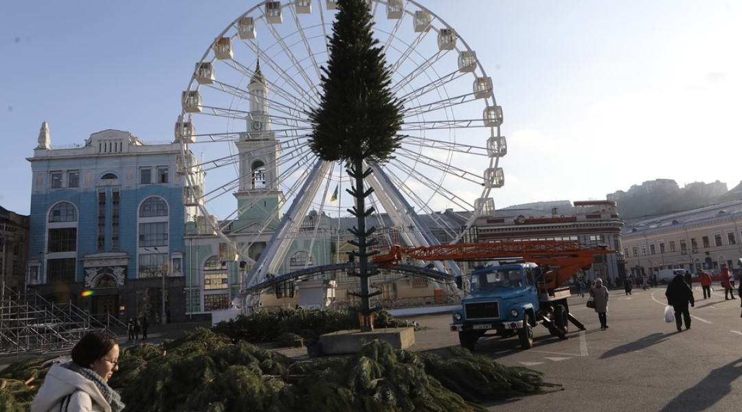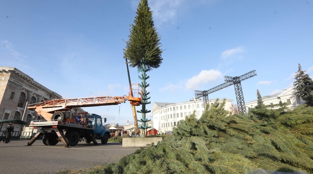На Контрактовій площі почали встановлювати новорічну ялинку