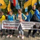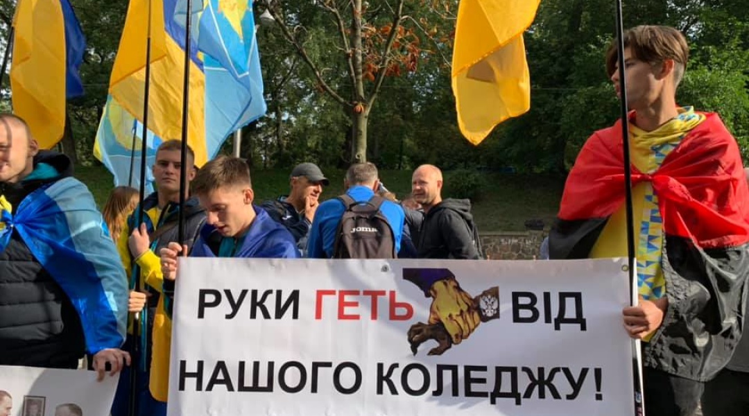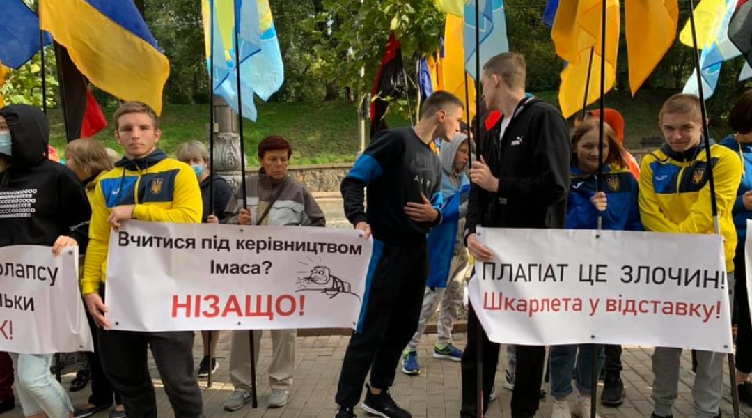 Студенти тримають плакати «Руки геть від нашого коледжу», «Дайте нам можливіть завоювати олімпійське золото для України», «Олімпійський спорт проти державного рейдерства», "Плагіат - це злочин. Шкарлета у відставку!" та ін.