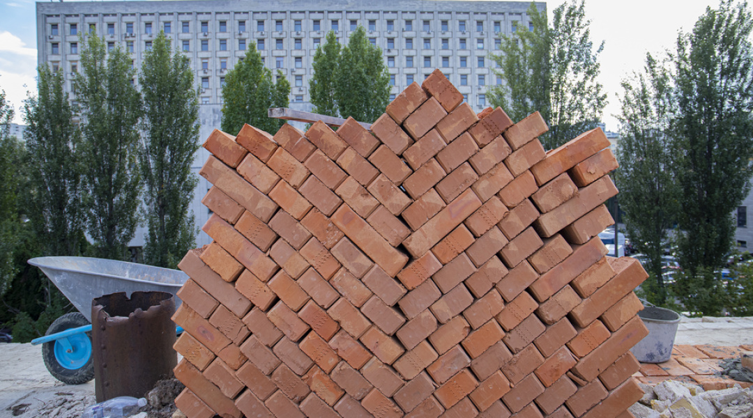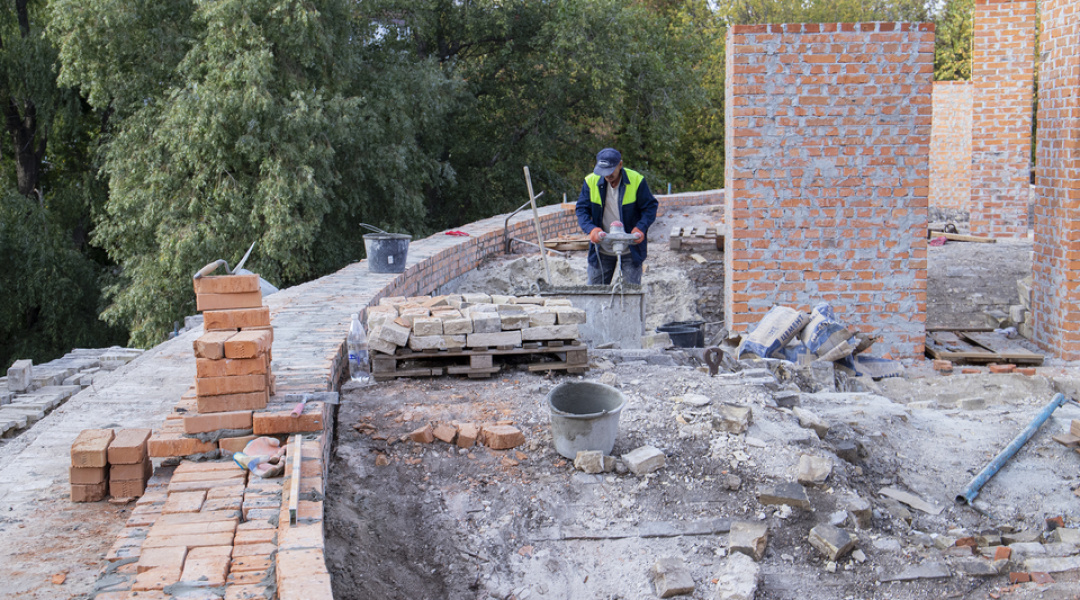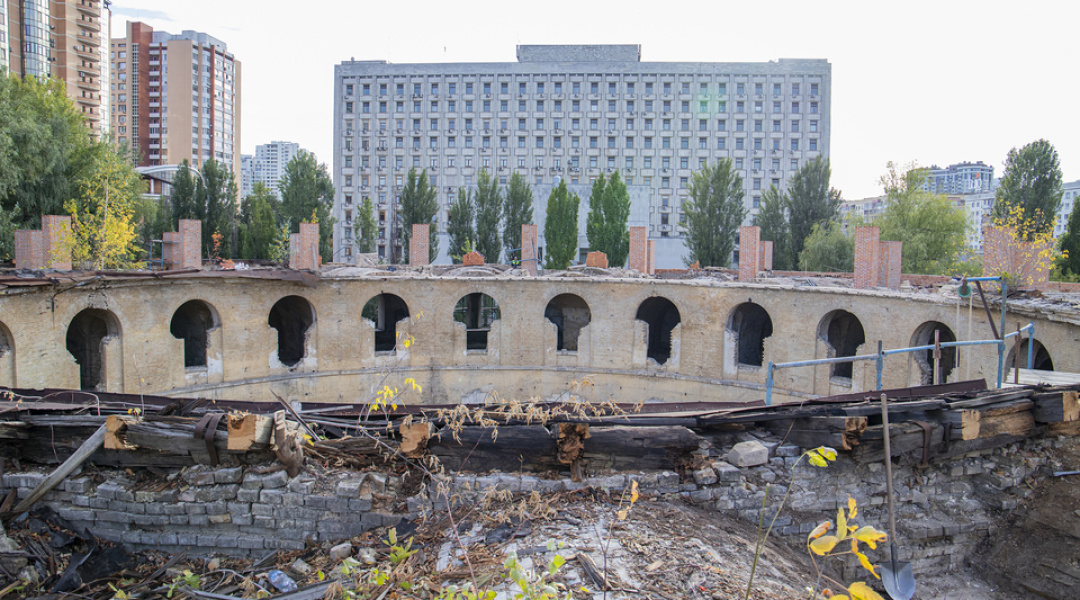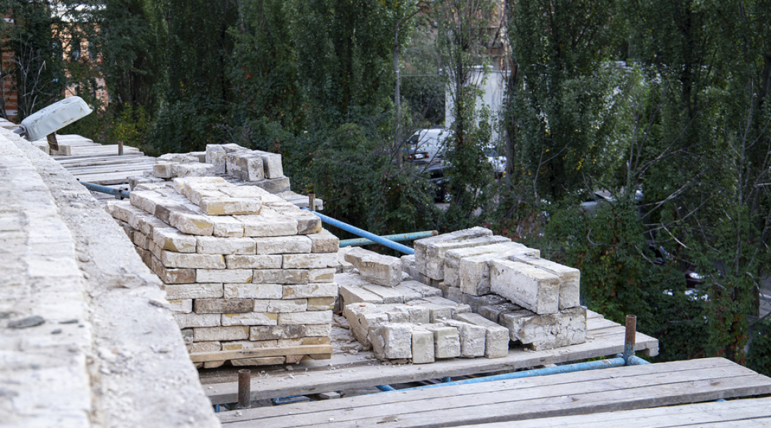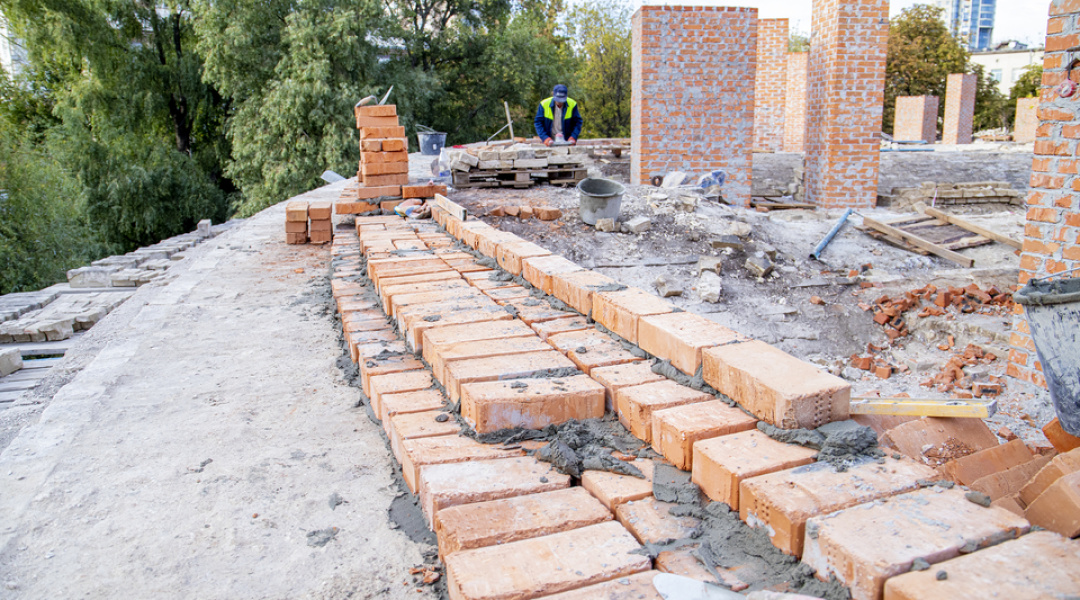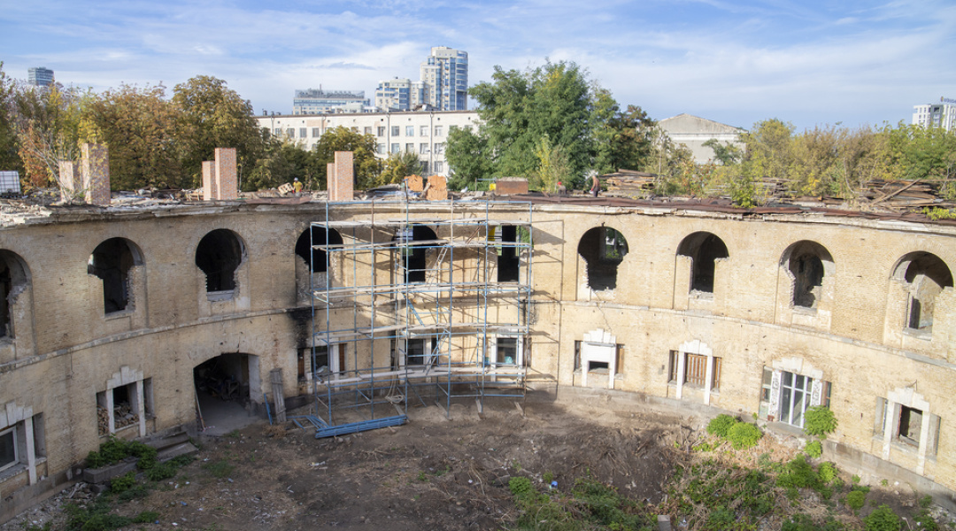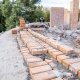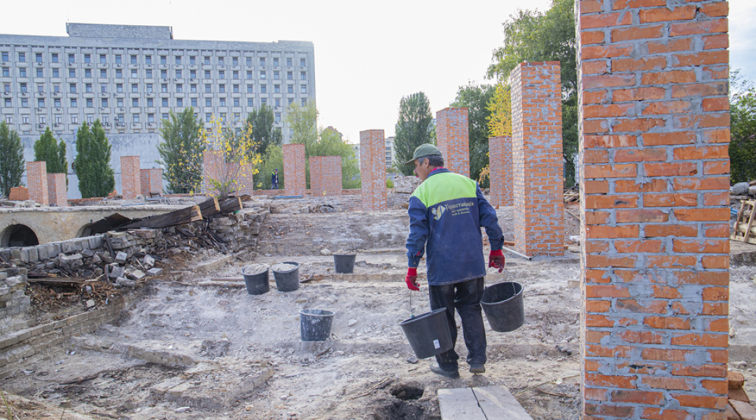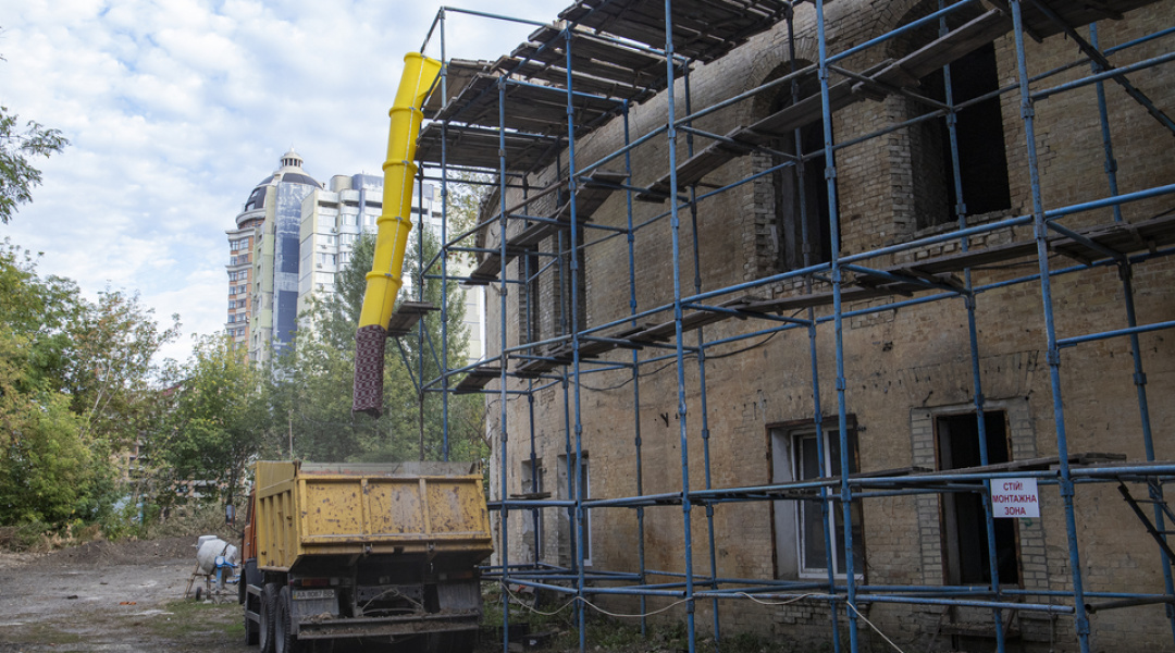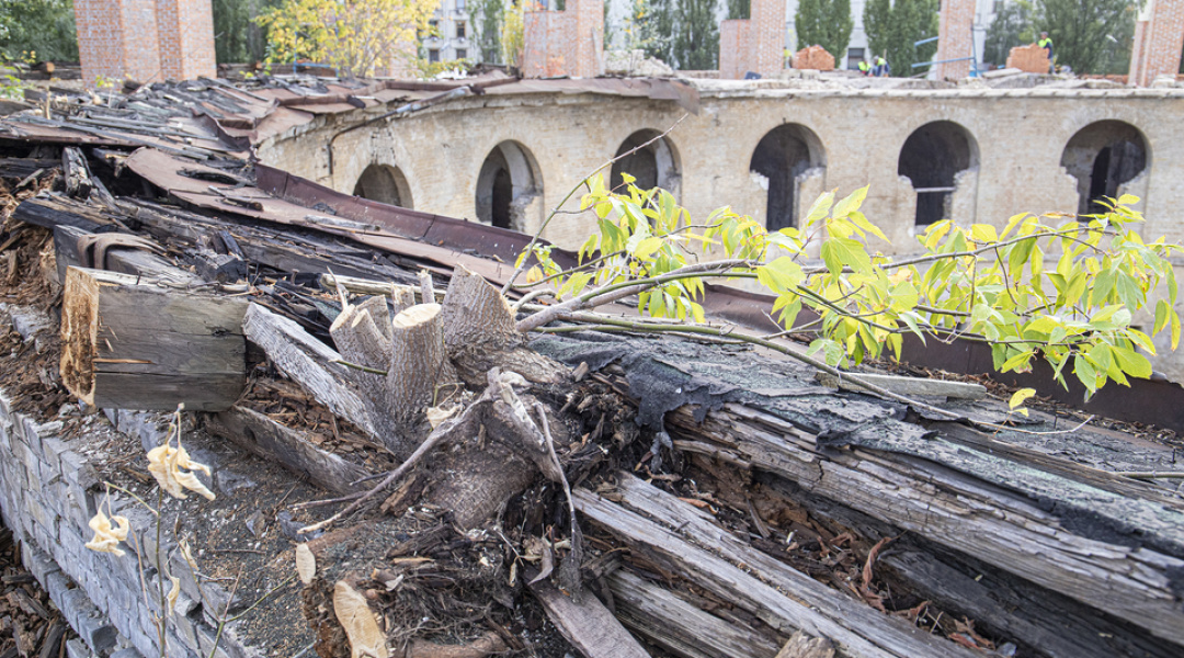 Нині тривають роботи з будівництва та перекладання верхньої частини зовнішньої стіни, на яку має спиратися конструкція даху.