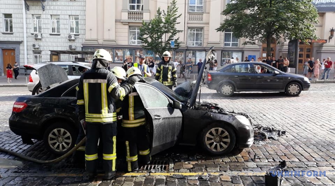 “О 17:13 до нас надійшло повідомлення про те, що на вулиці Богдана Хмельницького неподалік від метро Театральна загорівся автомобіль марки Mercedes. На місце було направлено рятувальників 4 пожежно-рятувальної частини. За 15-20 хвилин пожежу вже було ліквідовано, це з урахуванням часу, поки туди добиралися наші вогнеборці”, - поінформував Макушенко.