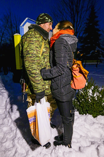 Боєць 55-ї окремої артилерійської бригади обіймається з дівчиною по поверненні із зони АТО на ротацію, Запоріжжя, 3 грудня 2014 року.