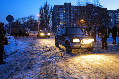 Рідні, друзі та волонтери чекають автомобіль з бійцями 55-ї окремої артилерійської бригади, які повернулись із зони АТО на ротацію, Запоріжжя, 3 грудня 2014 року.