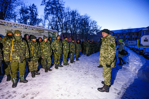 Бійці 55-ї окремої артилерійської бригади вишикувались на території військової частини "Уральські казарми" по поверненні із зони АТО на ротацію, Запоріжжя, 3 грудня 2014 року.