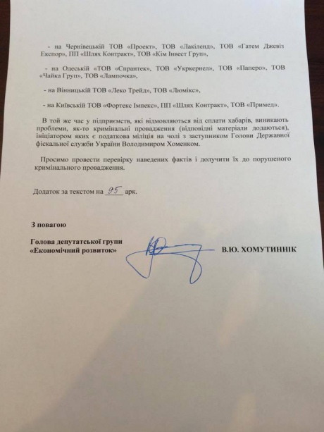 За словами Хомутинніка, організаторів таких поборів є заступник голови Державної фіскальної служби Анатолій Макаренко, директор департаменту аналізу ринків і протидії митним правопорушенням Олександр Мухін та співробітники інших правоохоронних органів.